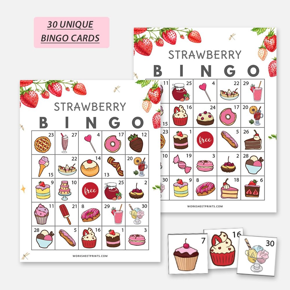 Our printable Strawberry Bingo Cards set is perfect for parties, classrooms, baby showers, berry-themed events, and summer activities. This picture bingo features sweets and desserts that are easy for all ages to recognize.